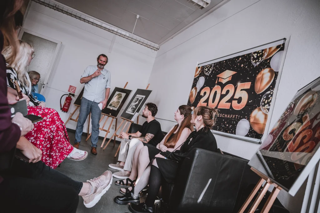 Abschlussprüfung und Museumsnacht im August 2024 Home Ausstellung im Februar 2025 Image #1 Am 28. Februar haben wir unsere Absolventinnen und Absolventen verabschiedet und deren Abschlussarbeiten neben Werken aus den übrigen Semestern präsentiert. Wer selbst nicht vor Ort sein konnte, kann hier über die Galerie und den 360°-Rundgang einen Eindruck von der Ausstellung erhalten.