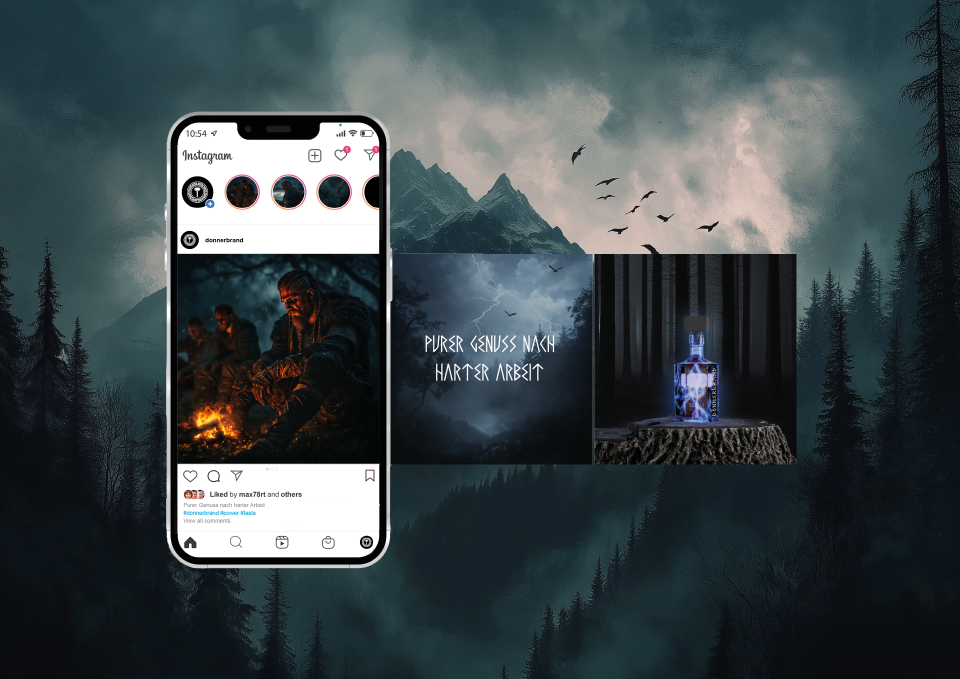 Die Kombination aus atmosphärischen Produktaufnahmen und mythologischen Zitaten erzeugt einen stimmigen Markenauftritt, der die Geschichte von „Donnerbrand“ authentisch in der digitalen Welt fortsetzt.
